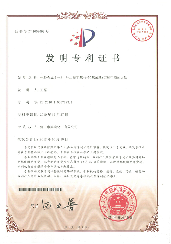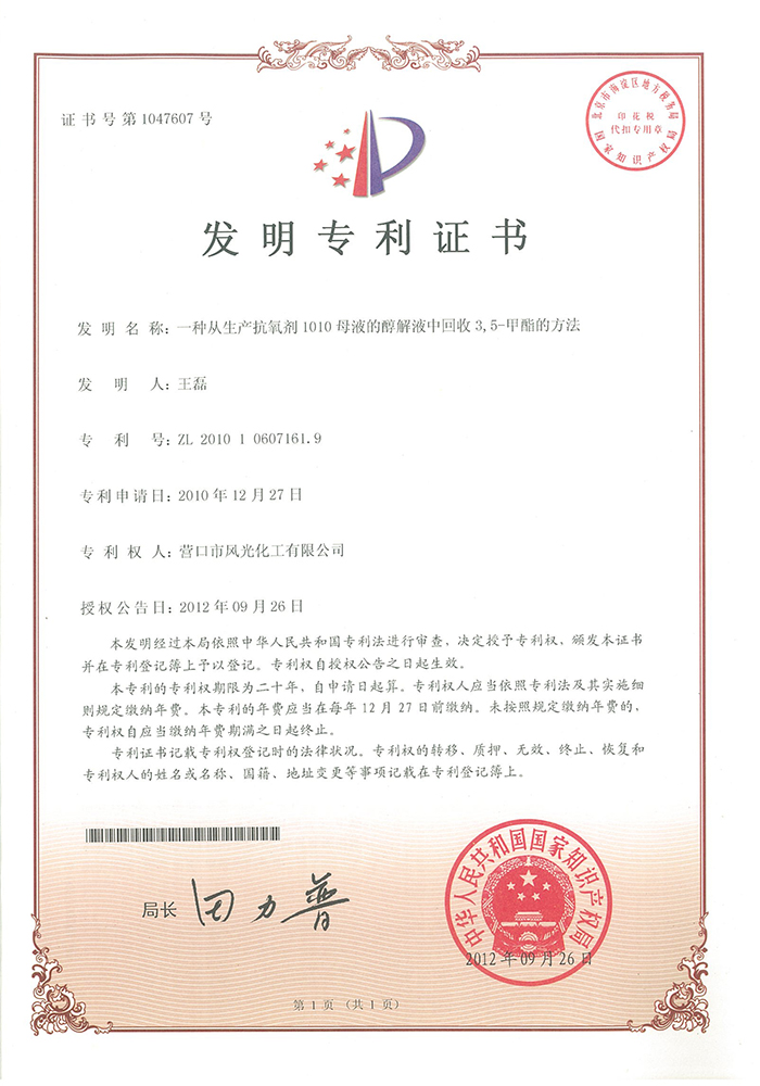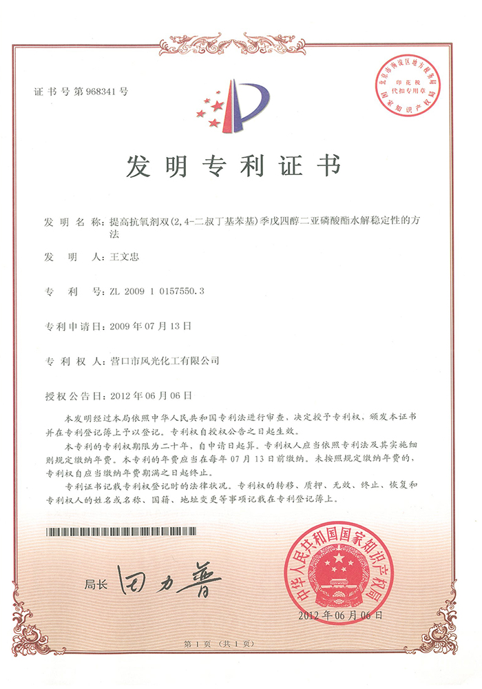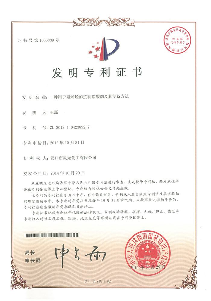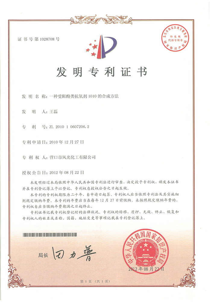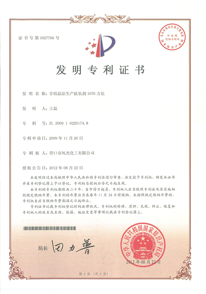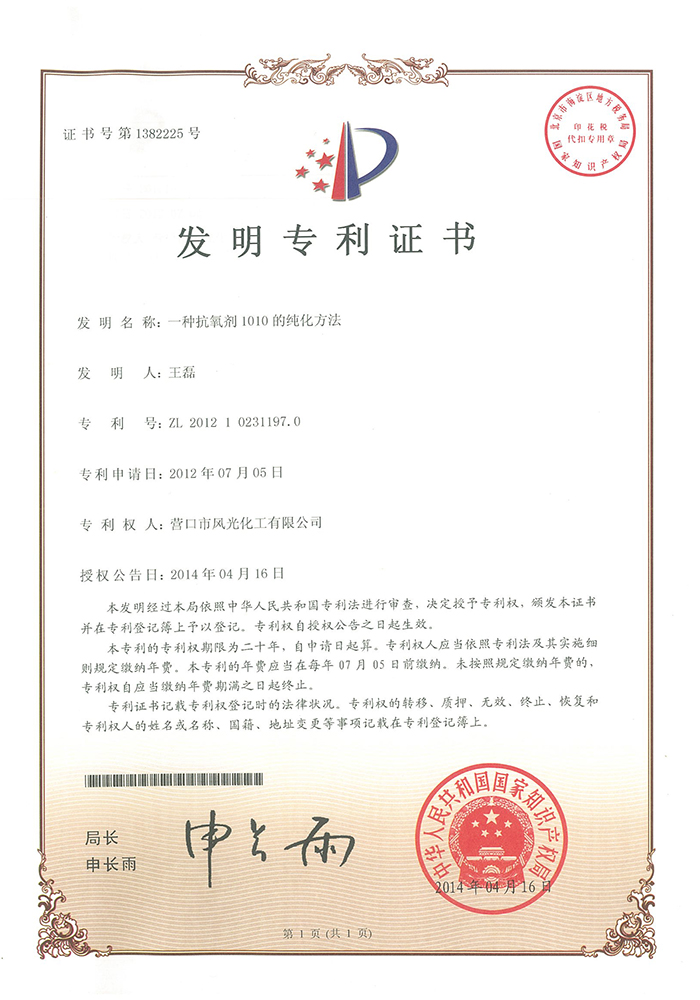 • 公司拥有34件授权专利,包括22件发明专利和12件实用新型专利,均为自主研发、自主申请。核心高新产品“高纯抗氧剂YFK-1010”、“亚磷酸酯类抗氧剂YFK-168”、“高效复合造粒抗氧剂”、“抗水解抗氧剂YFK-626”、“受阻酚类抗氧剂YFK-1076”均已完成布局专利。